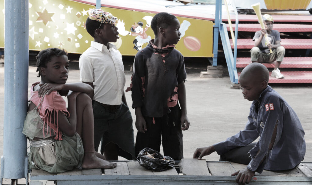Maputo, Mozambique. It’s Sunday afternoon. Maputo’s country show is bursting with life. Children are queueing up at the most popular carousel—the airplane carousel. Gito, Babu, Nuno and Lisa live on the street, but they have come to the country show too. They walk among the carousels, looking for the opportunity to have at least one ride on the carousels, to feel like children again.