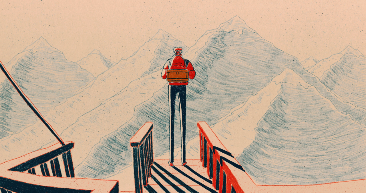 Everyday, a father and his son jump with a parachute from a vertiginous cliff, to go to the village on the ground, far away where they sell the ice they produce.