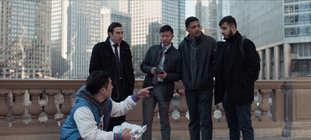 A young hustler, with a big red suitcase, runs throughout the city of Chicago carrying around his new business: a mobile gift shop.
