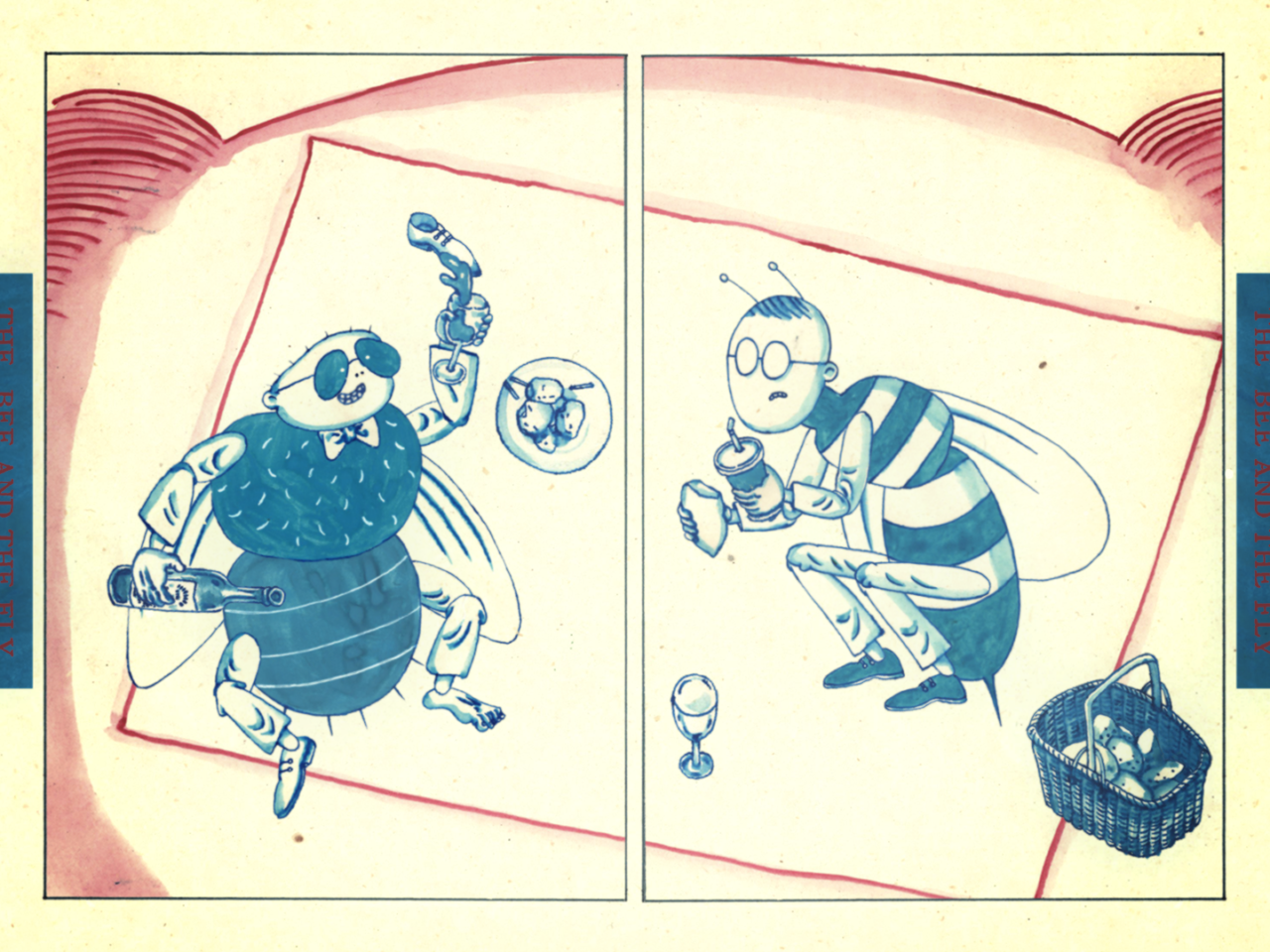 Una mosca e un’ape sono le protagoniste di questo cortometraggio. Le due, amiche, sono alla ricerca di un luogo dove poter vivere tranquillamente e osservare il mondo. Sembrano trovarlo sulla testa, pelata, di una personalità importante. Ma sarà davvero un posto sicuro?