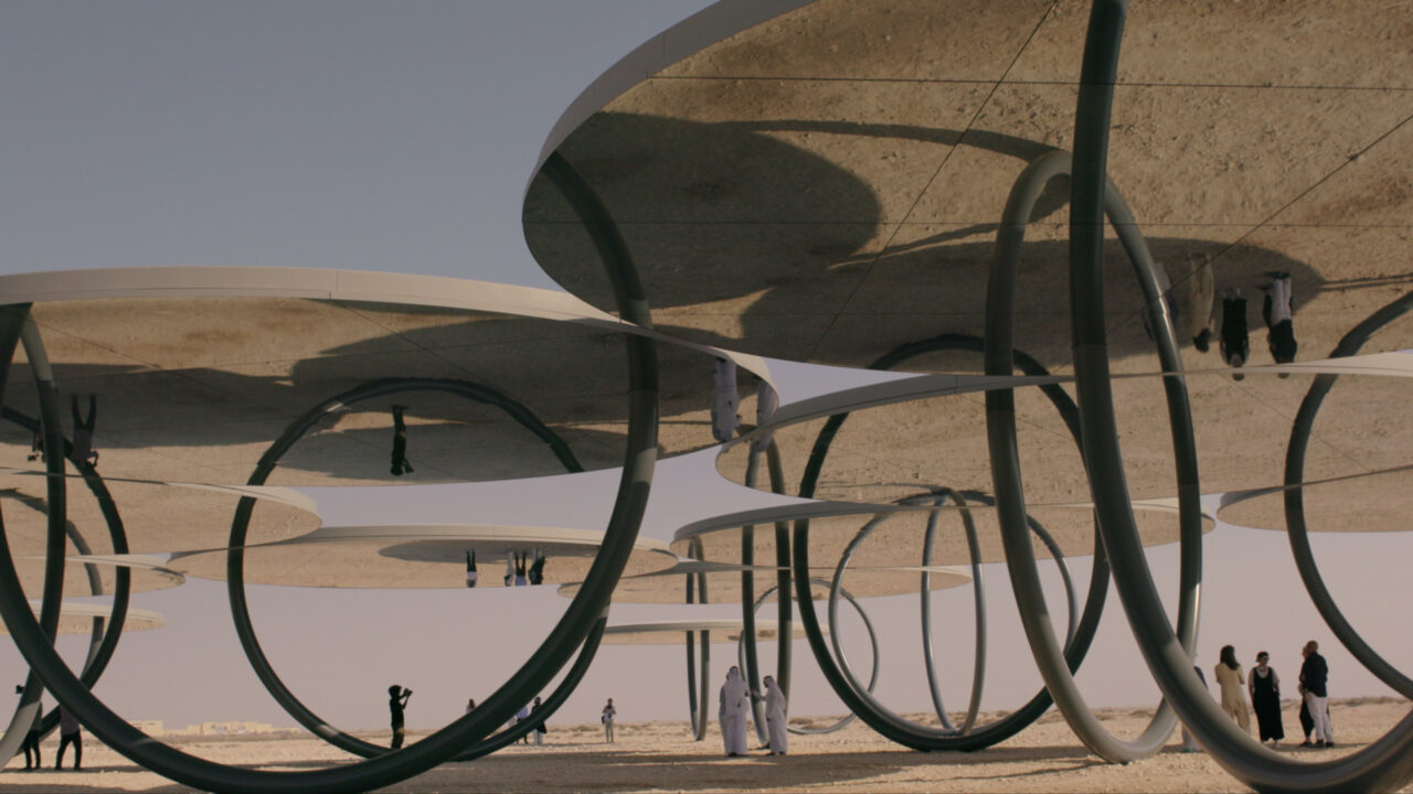 L’artista Olafur Eliasson ha costruito un esperimento mozzafiato nell’aspro paesaggio del deserto del Qatar. Una vasta rete di elementi scultorei si dispiega sulla sabbia sostenendo degli specchi.